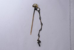 Smeigtukas su Baltijos gintaru ir grandinėle su antgaliu. Smeigtuko ilgis apie 12 cm. Kūryba ir atlikimas: Darata Surdokaitė